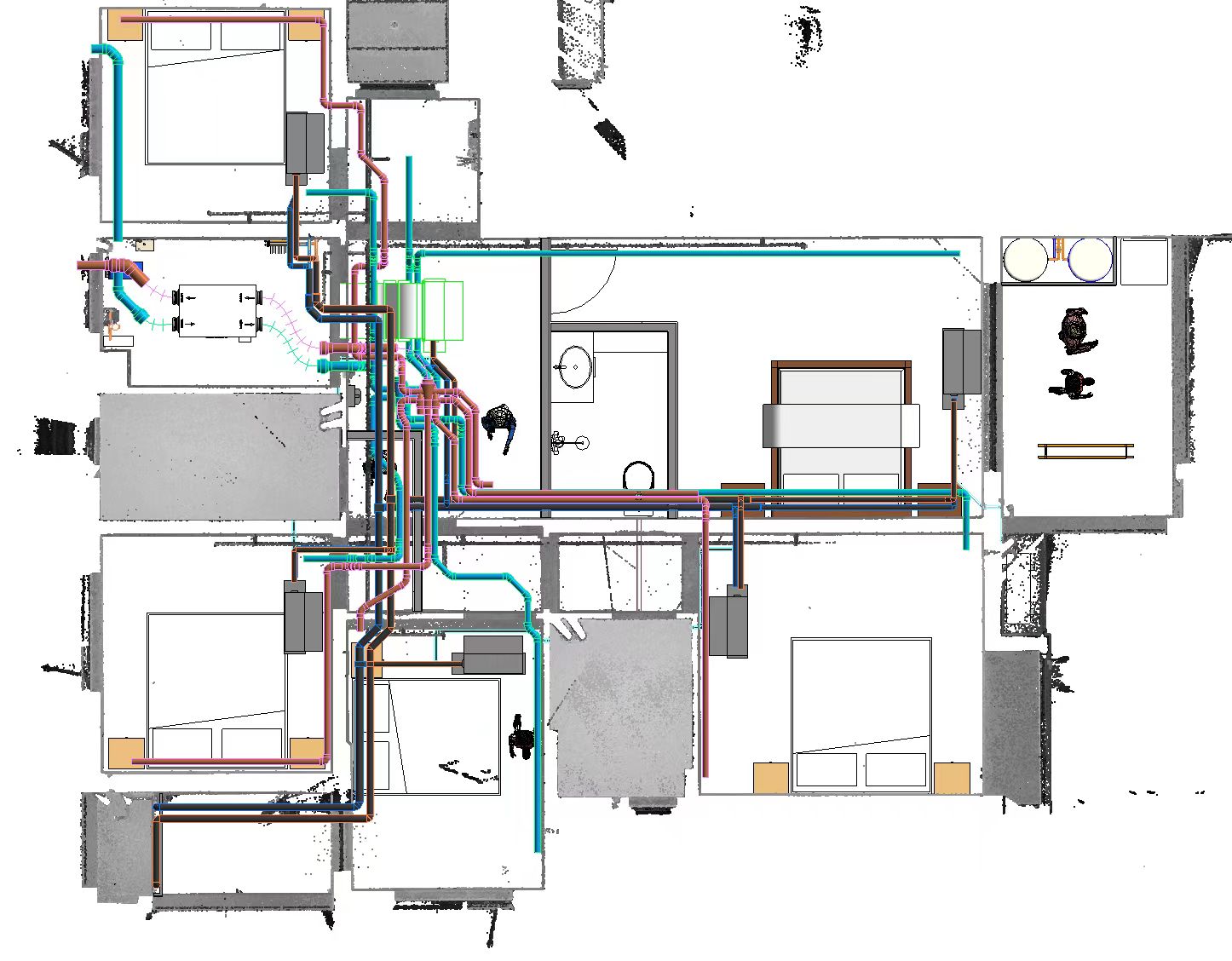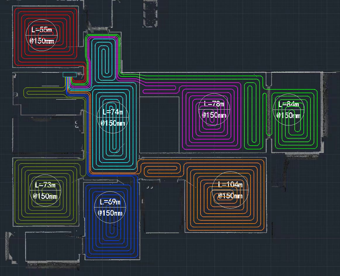 - 地暖盘管的设计采用专业的地暖管道设计软件,对每路提前设计好,并进行仔细的调整,确保每路的长度差不多一致,防止水力不平衡导致冷热不均的情况出现。