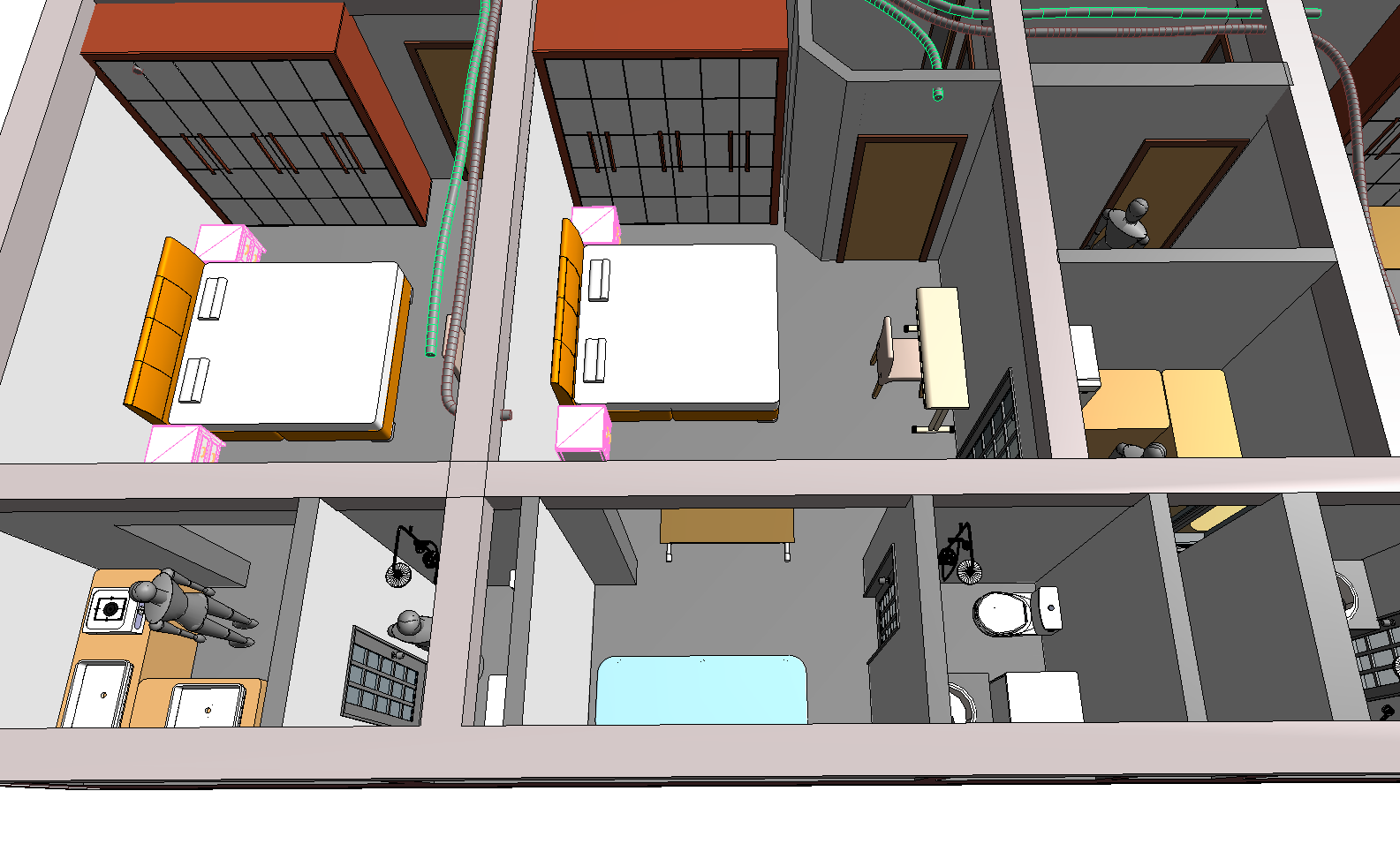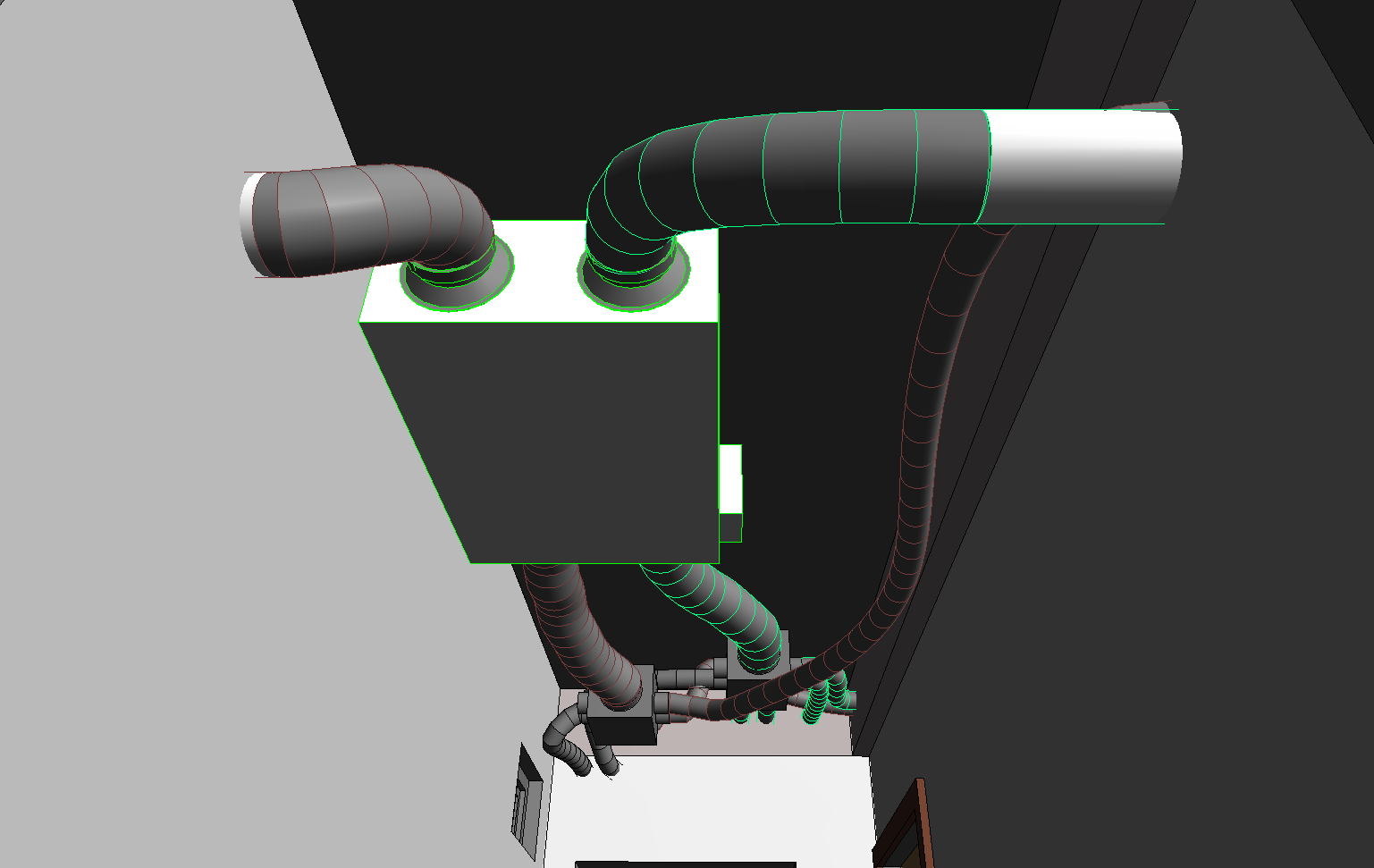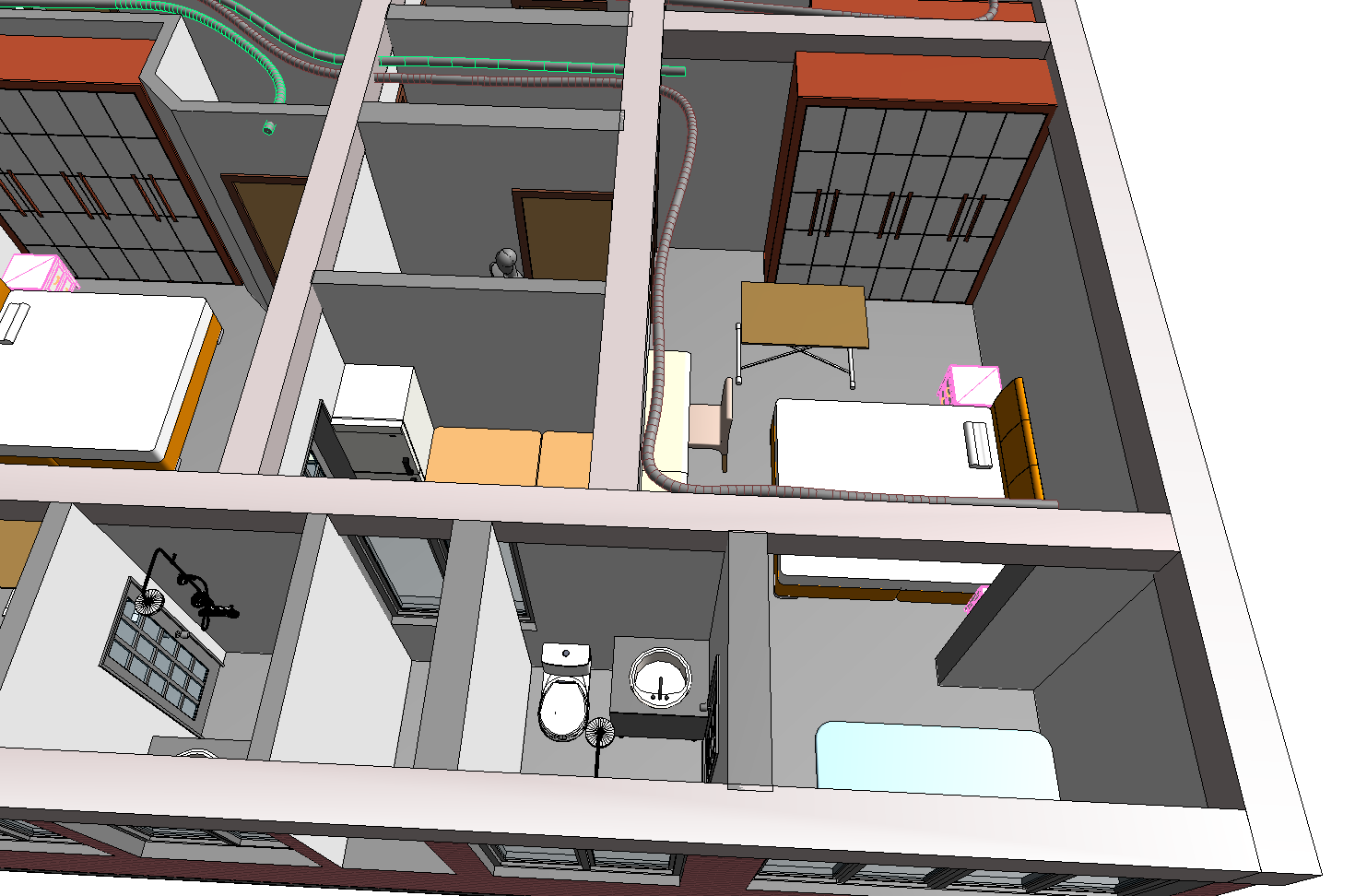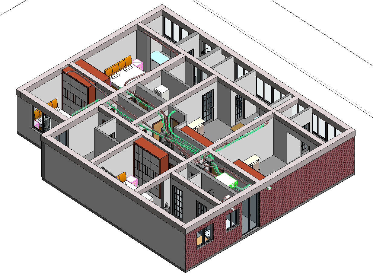 - 本项目不仅包含新风系统的设计,同时业主希望我们能帮他进行室内设计,并支付相应的设计费,因此优筑的工程师首先进行了三维激光扫描,获取了房屋原始建筑主体三维点云模型,然后基于三维点云模型进行了翻模,重新手动创建了建筑主体3D模型,之后再基于这个模型进行整个室内的装修设计和新风系统设计。在设计过程中,依然需要反复显示、隐蔽三维点云模型,以进行精确的检查,防止设计出现误差。