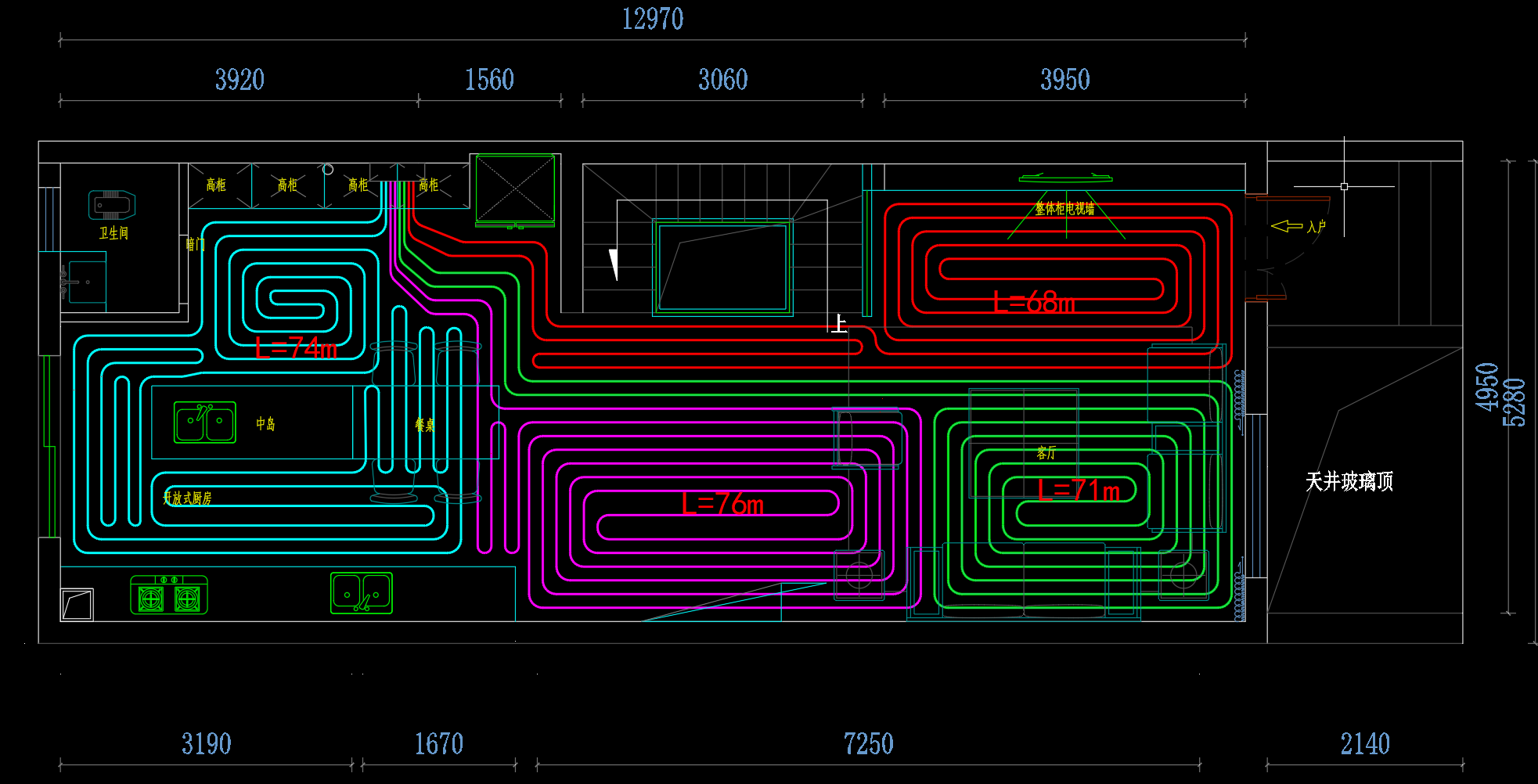 • 地暖盘管的设计采用专业的地暖管道设计软件,对每路提前设计好,并进行仔细的调整,确保每路的长度差不多一致,防止水力不平衡导致冷热不均的情况出现。