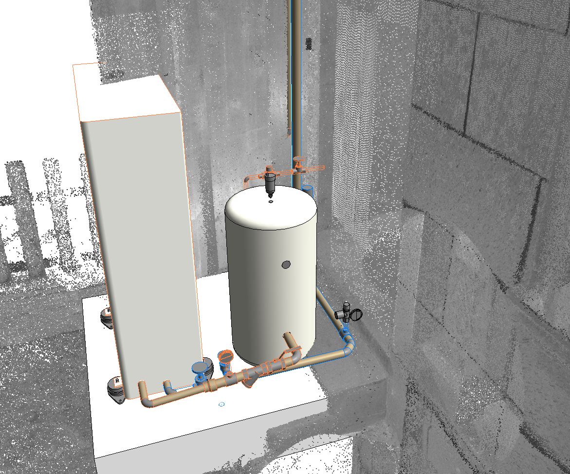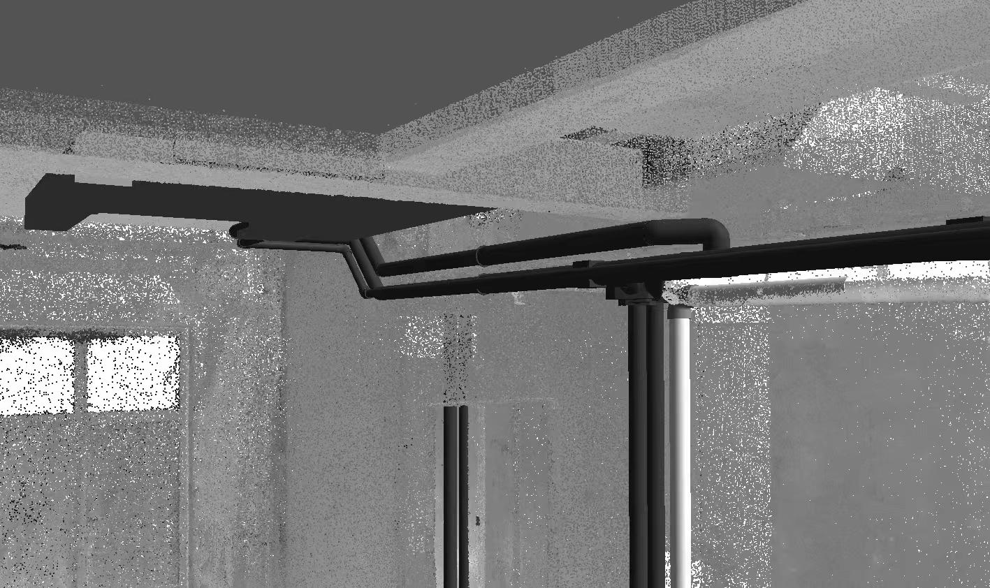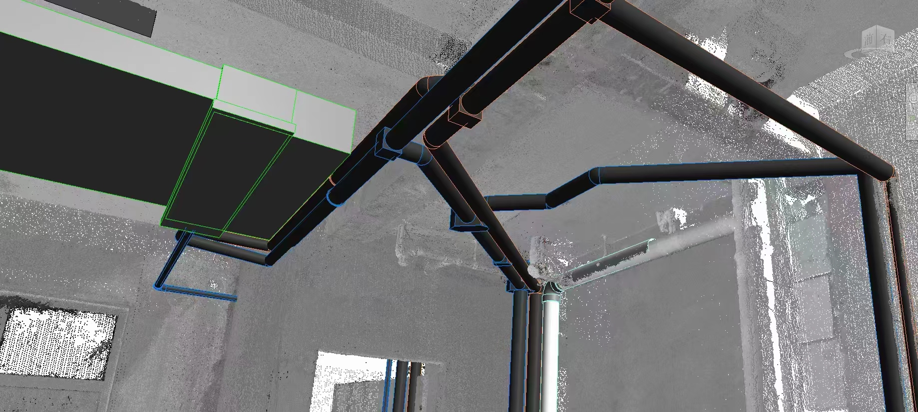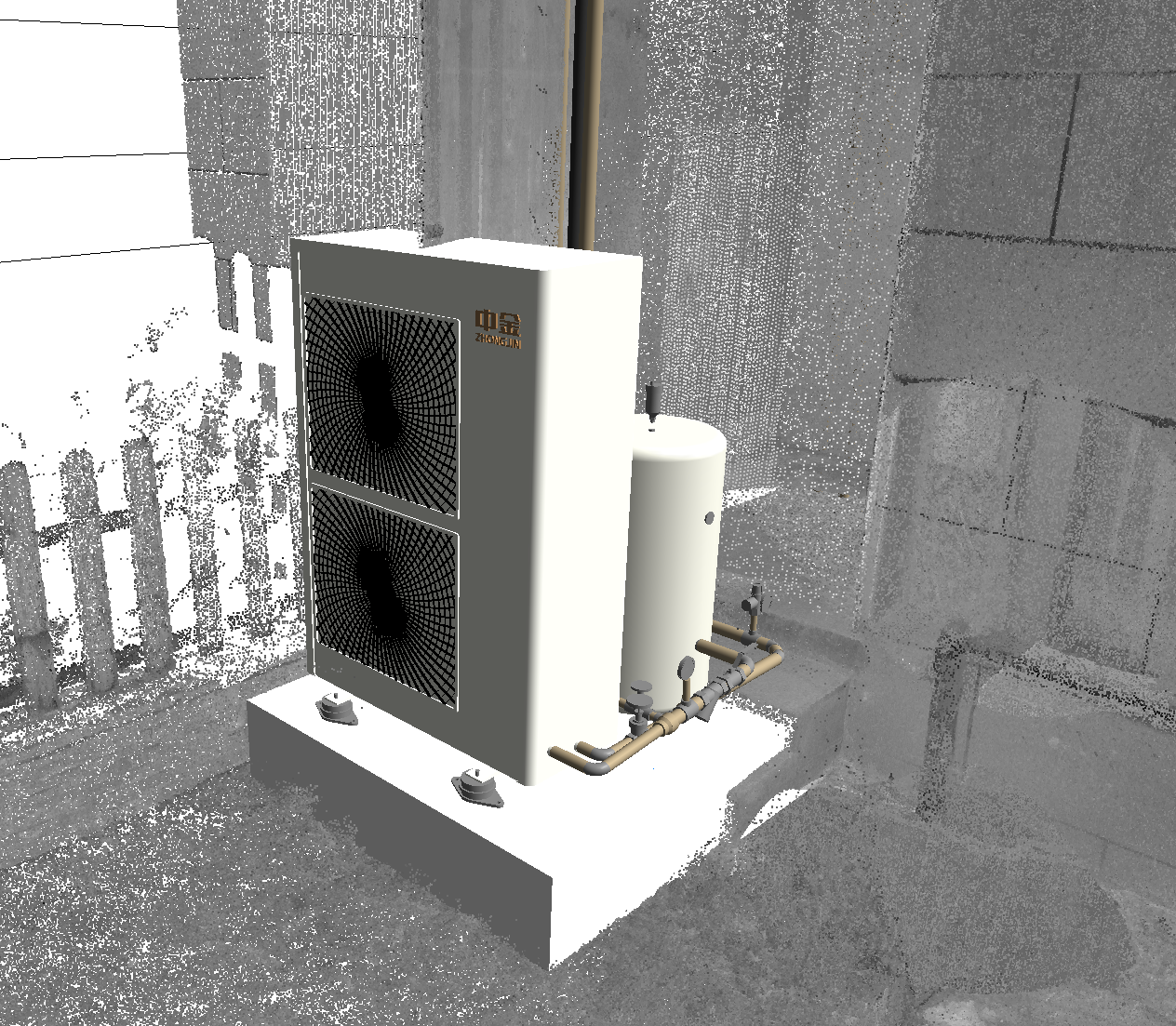 • 本项目虽然集五大系统:地暖、中央空调、热水、新风、净水于一体。优筑工程师按优筑工作流程进行设计与施工,即以专业工程师为核心,利用先进的三维激光扫描仪,快速准确获取现场环境点云模型,再导入专业级BIM软件,设计出所见即所得的暖通机电3D模型,经过与各方沟通协调后,确认最终方案。
